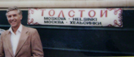Fran Macy, Director of the first AHP-Soviet Exchange Project delegation in September 1983 standing in front of the Russian train, The Tolstoy.
